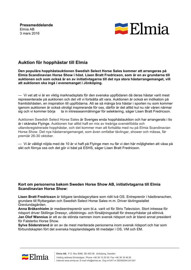 Den populära hopphästauktionen Swedish Select Horse Sales kommer att arrangeras på Elmia Scandinavian Horse Show i höst. Lisen Bratt Fredricson, som är en av grundarna till auktionen och som också är en av initiativtagarna till det nya stora hästarrangemanget, vill att auktionen ska ingå i evenemanget i Jönköping. Elmia Scandinavian Horse Show får premiär 26-30 oktober.