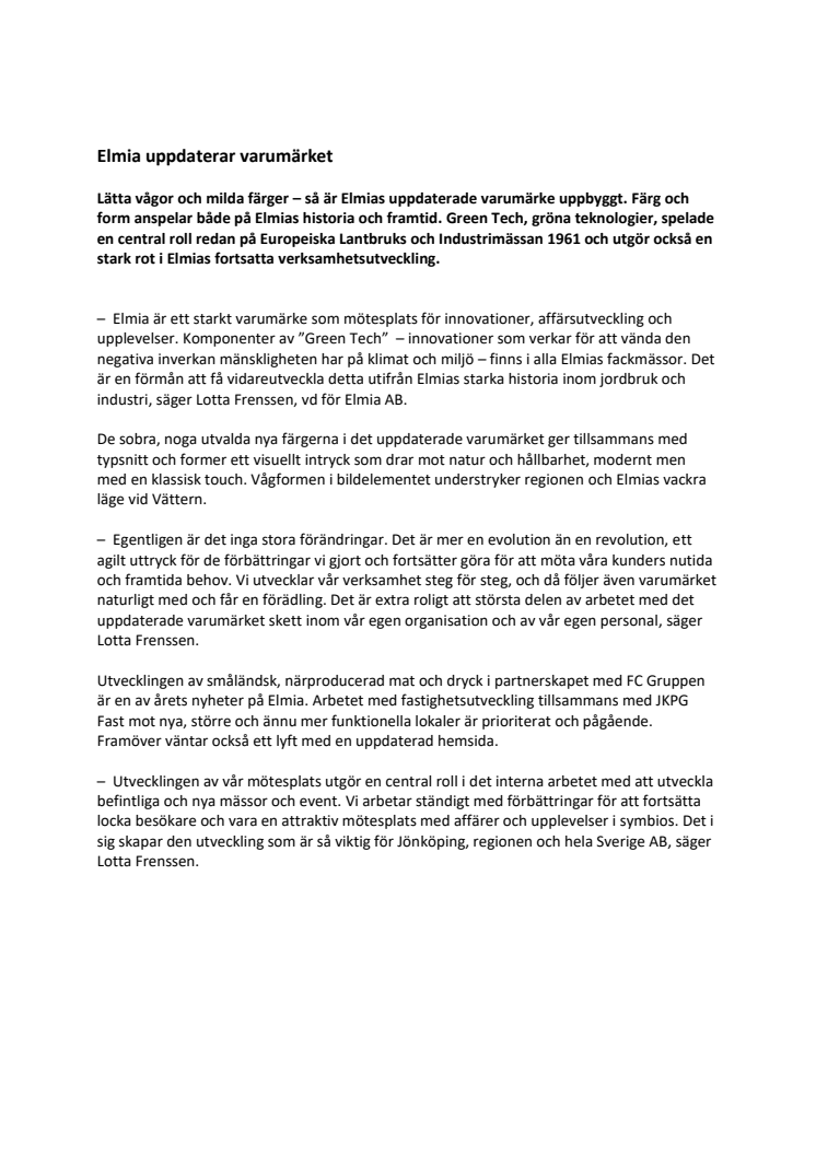 Lätta vågor och milda färger – så är Elmias uppdaterade varumärke uppbyggt. Färg och form anspelar både på Elmias historia och framtid. Green Tech, gröna teknologier, spelade en central roll redan på Europeiska Lantbruks och Industrimässan 1961 och utgör också en stark rot i Elmias fortsatta verksamhetsutveckling.