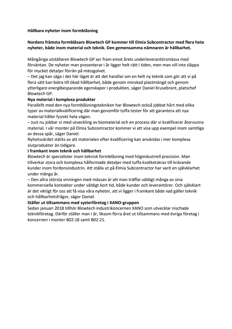 Nordens främsta formblåsare Blowtech GP kommer till Elmia Subcontractor med flera heta nyheter, både inom material och teknik. Den gemensamma nämnaren är hållbarhet.