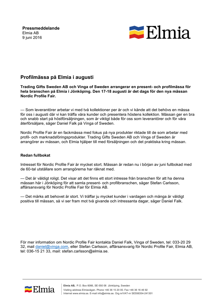 Trading Gifts Sweden AB och Vinga of Sweden arrangerar tillsammans en present- och profilmässa för hela branschen i Jönköping. Den 17-18 augusti är det dags för Nordic Profile Fair på Elmia.