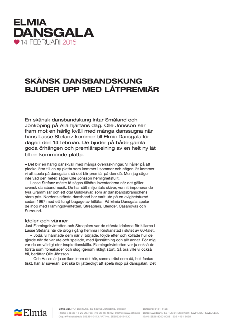En skånsk dansbandskung intar Småland och Jönköping på Alla hjärtans dag. Olle Jönsson ser fram mot en härlig kväll med många danssugna när hans Lasse Stefanz kommer till Elmia Dansgala lördagen den 14 februari. De bjuder på både gamla goda örhängen och premiärspelning av en helt ny låt till en kommande platta.