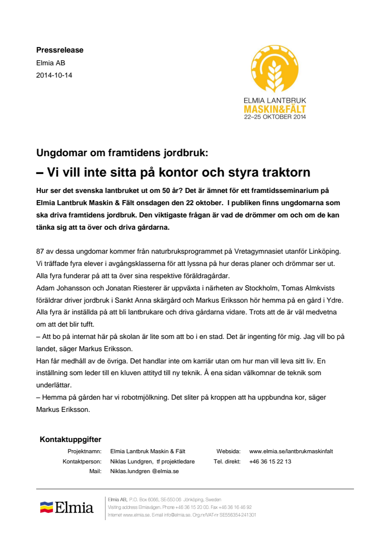 Hur ser det svenska lantbruket ut om 50 år? Det är ämnet för ett framtidsseminarium på Elmia Lantbruk Maskin & Fält onsdagen den 22 oktober. I publiken finns ungdomarna som ska driva framtidens jordbruk. Den viktigaste frågan är vad de drömmer om och om de kan tänka sig att ta över och driva gårdarna.