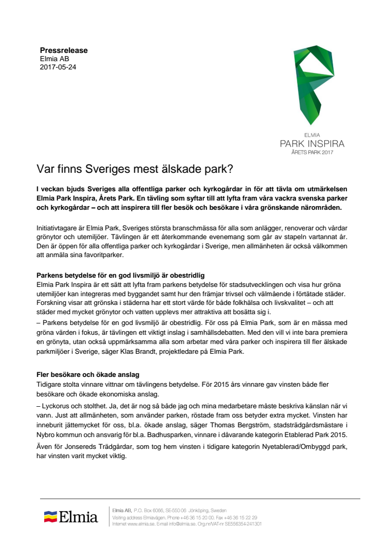 I veckan bjuds Sveriges alla offentliga parker och kyrkogårdar in för att tävla om utmärkelsen Elmia Park Inspira, Årets Park. En tävling som syftar till att lyfta fram våra vackra svenska parker och kyrkogårdar – och att inspirera till fler besök och besökare i våra grönskande närområden.