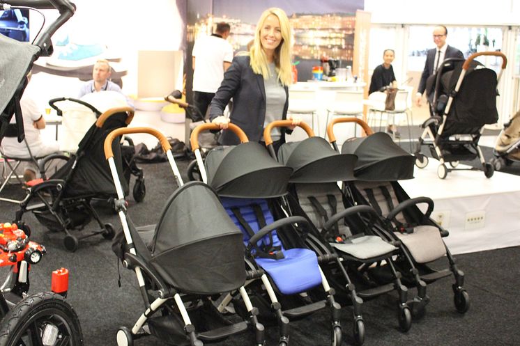Med det nya patenterade systemet Bumprider Connect går det enkelt och snabbt att koppla ihop och isär barnvagnar efter behov, visar Camilla Lindblad, vvd Elite Group AB. Foto: Elmia AB.