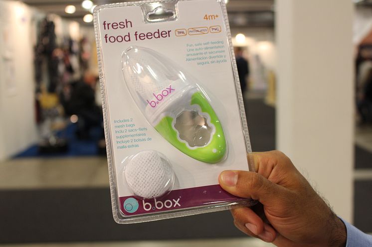 Apelsinklyftan och äppelbiten kan ges säkert till de minsta i Fresh Food Feeder från b.box, som visades av IBP Scandinavia på Allt för Barn & Baby. Foto: Elmia AB.