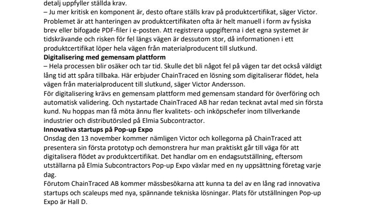 Onsdag den 13 november kommer nämligen Victor och kollegorna på ChainTraced att presentera sin första prototyp och demonstrera hur man praktiskt går till väga för att digitalisera flödet av produktcertifikat. Det handlar om en endagsutställning, eftersom utställarna på Elmia Subcontractors Pop-up Expo växlar med en ny uppsättning företag varje dag.