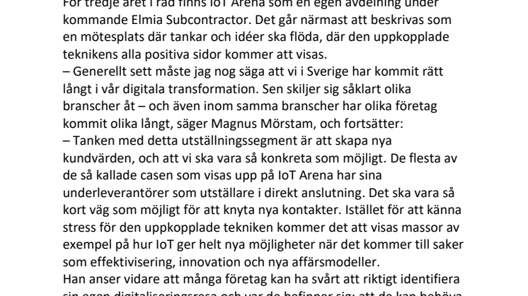 För tredje året i rad finns IoT Arena som en egen avdelning under kommande Elmia Subcontractor. Det går närmast att beskrivas som en mötesplats där tankar och idéer ska flöda, där den uppkopplade teknikens alla positiva sidor kommer att visas.