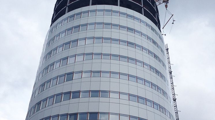 - Uppbyggnaden av området går snabbt i detta skede, ett kvarter i kvartalet. Den första hyresgästen i det runda huset flyttar in vid jul på de översta fem våningsplanen. Genom att bygga husen tätt efter varandra blir det väldigt kort tid som de redan inflyttade behöver bo bredvid en byggarbetsplats, berättar Tommy Fritz.