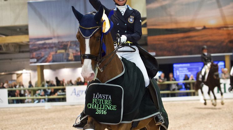 Intresset var stort för Lövsta Future Challenge när sista kvalet för unga hästar avgjordes under söndagen på Elmia Scandinavian Horse Show inför fullsatta läktare. Elva ekipage med hästar som var upp till och med elva år gamla red programmet ”FEI Grand Prix UR (16-25). Klassens domare var Anette Fransén Iacobaeus, Gustav Svalling och Magnus Ringmark. Minna Telde och Isac tog hem segern i klassen med 70,659% och andraplatsen knep Eva Fahlbrink och Amberson med 68,023%