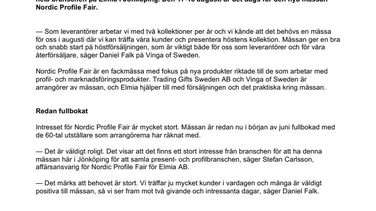 Trading Gifts Sweden AB och Vinga of Sweden arrangerar en present- och profilmässa för hela branschen på Elmia i Jönköping. Den 17-18 augusti är det dags för den nya mässan Nordic Profile Fair.