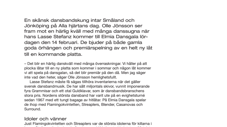 En skånsk dansbandskung intar Småland och Jönköping på Alla hjärtans dag. Olle Jönsson ser fram mot en härlig kväll med många danssugna när hans Lasse Stefanz kommer till Elmia Dansgala lördagen den 14 februari. De bjuder på både gamla goda örhängen och premiärspelning av en helt ny låt till en kommande platta.