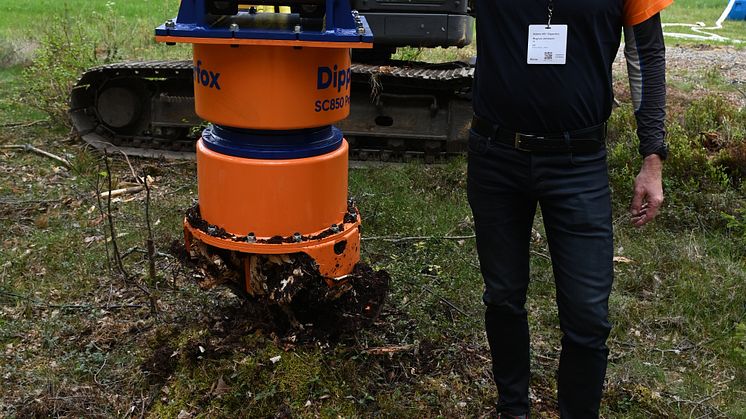 En maskin som första gången visas upp i riktig demo på en mässa är Dipperfox stubbfräs. Det kraftfulla aggregatet beskrivs som multikompatibelt med fästen för olika typer av maskiner.
