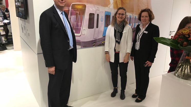 Michael Thulin, Annelie Andersson och Monica Öhlander på Bombardier framför det nya C30-tåget som ska trafikera Stockholms tunnelbana.